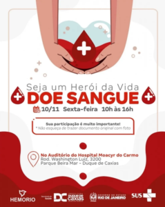 A Secretaria Municipal de Saúde de Duque de Caxias, em parceria com o Hemorio, vai realizar um mutirão de coleta de sangue nesta sexta-feira, das 10h às 16h, no Hospital Municipal Dr. Moacyr Rodrigues do Carmo (HMMRC). Podem participar da doação pessoas saudáveis com idades entre 16 e 69 anos, pesando, no mínimo, 50kg.