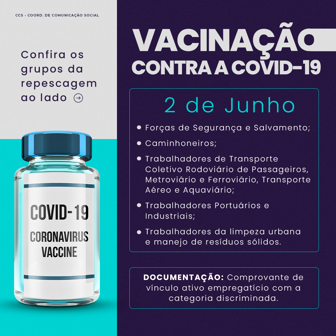 Mesquita convoca para a vacinação contra covid-19 nesta quarta-feira, dia 2 de junho, os grupos prioritários que faltam ser imunizados na campanha de vacinação contra covid-19. Assim, serão imunizados os profissionais de forças de segurança e salvamento; caminhoneiros; trabalhadores de transporte coletivo rodoviário de passageiros, metroviário, ferroviário, transportes aéreos e aquaviários; trabalhadores portuários e industriais; e trabalhadores da limpeza urbana e manejo de resíduos sólidos. Para isso, eles precisam apresentar um comprovante de vínculo empregatício ativo com uma destas categorias.