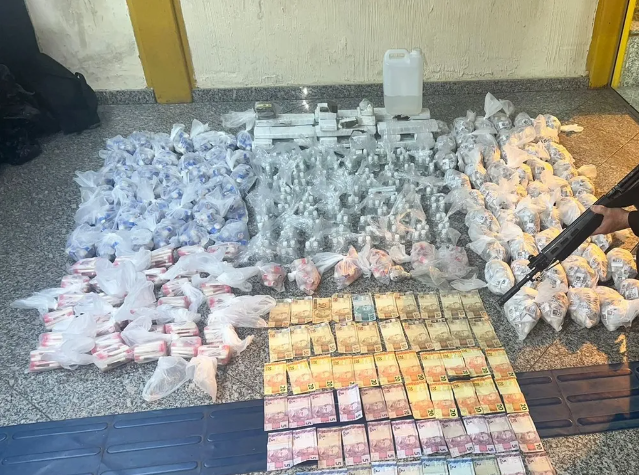 Ao todo, foram apreendidos 4.348 cápsulas de cocaína, 200 frascos de lança perfume, um galão, de aproximadamente 2 litros, de lança perfume, duas pedras de crack, 43 tabletes de maconha, um celular e R$ 1.407 em espécie.
