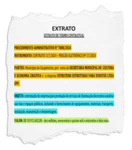 Tanto que o valor contratado supera em quase R$ 5 milhões a gasto verificado em 2023 com o mesmo objeto: “contratação de empresa para prestação de serviços de iluminação decorativa natalina nas vias e espaços públicos, incluindo o fornecimento de equipamentos, materiais, transporte, instalação, manutenção e desmontagem”.