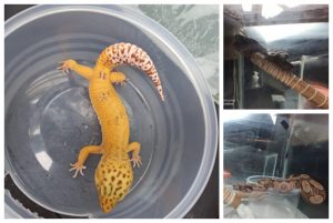 Ao todo, 3 cobras - duas jiboias e uma corn snake - foram apreendidas; uma lagartixa gecko também foi encontrada no local