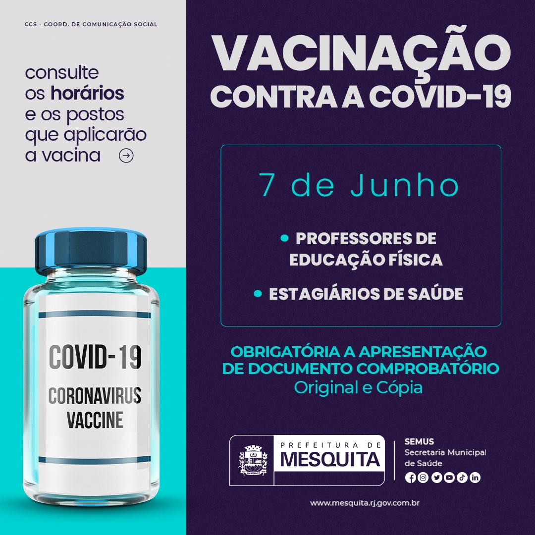 Mesquita convoca para a vacinação contra covid-19 nesta segunda-feira, dia 7 de junho, os professores de Educação Física e os estagiários que atuam em áreas da saúde e que têm a partir de 18 anos. Além disso, as pessoas que fazem parte de algum dos grupos prioritários elencados no Plano Nacional de Operacionalização da Vacinação contra a Covid-19 e que ainda não tomaram a primeira dose podem aproveitar para se imunizar também. A vacinação de primeira dose estará acontecendo nos três polos de vacinação contra covid-19 da cidade. O horário é das 8h às 17h nas clínicas da família Jacutinga e São José e das 8h às 16h no drive-thru montado no Paço Municipal.