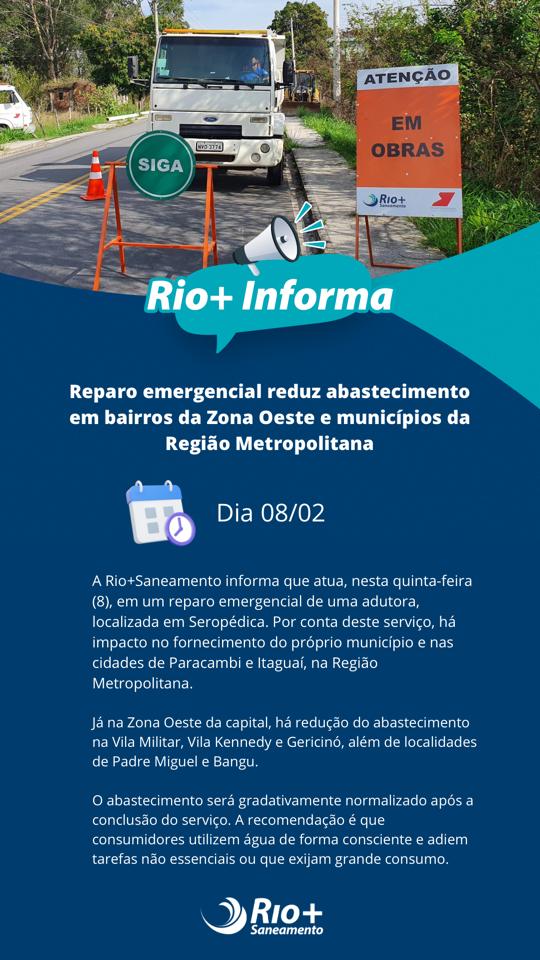 A Rio+Saneamento informa que está realizando, nesta quinta-feira (8), um reparo emergencial em uma adutora localizada em Seropédica. Devido a esse serviço, há impacto no fornecimento de água no próprio município e nas cidades de Paracambi e Itaguaí, na Região Metropolitana.
